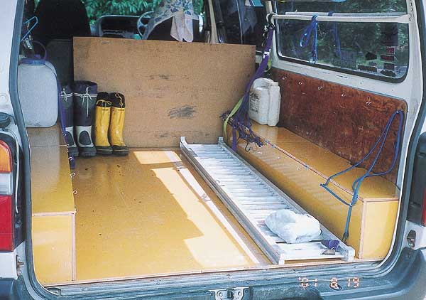 出来上がった荷室を見ながらしばしぼう然。ここまで約5時間かかりました。自分で誉めるのもなんだけど、なかなか見栄えのいいものができました。しかもカラーコンパネなので、出来上がったものにカーペットやマットを敷かなくてイイのでラクチン!